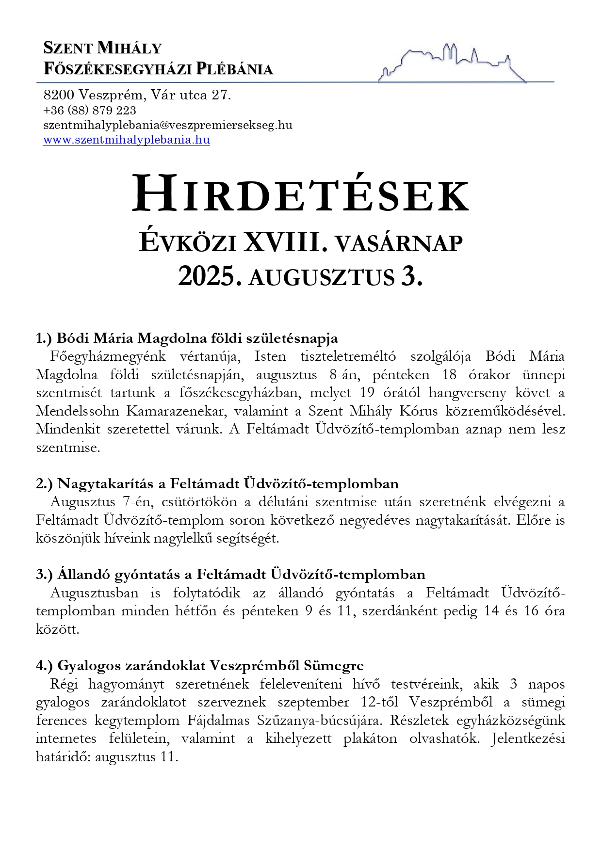 Kezdőlap / Hírek / Hirdetések, Évközi XVIII. vasárnap